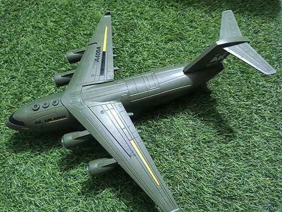 - REALISTIC DESIGN: Detailed army green aircraft model with authentic transport plane styling, featuring precise detailing and yellow stripe accents