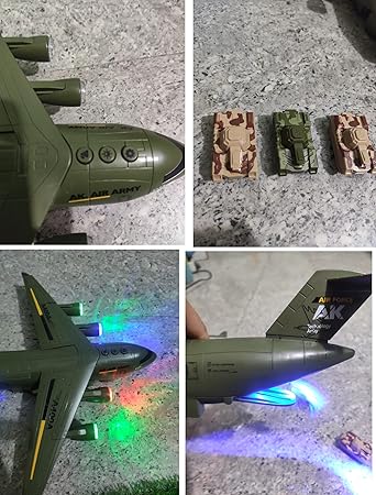 - BONUS ACCESSORIES: Includes 3 miniature military tanks in desert and green camouflage patterns that can be loaded into the aircraft