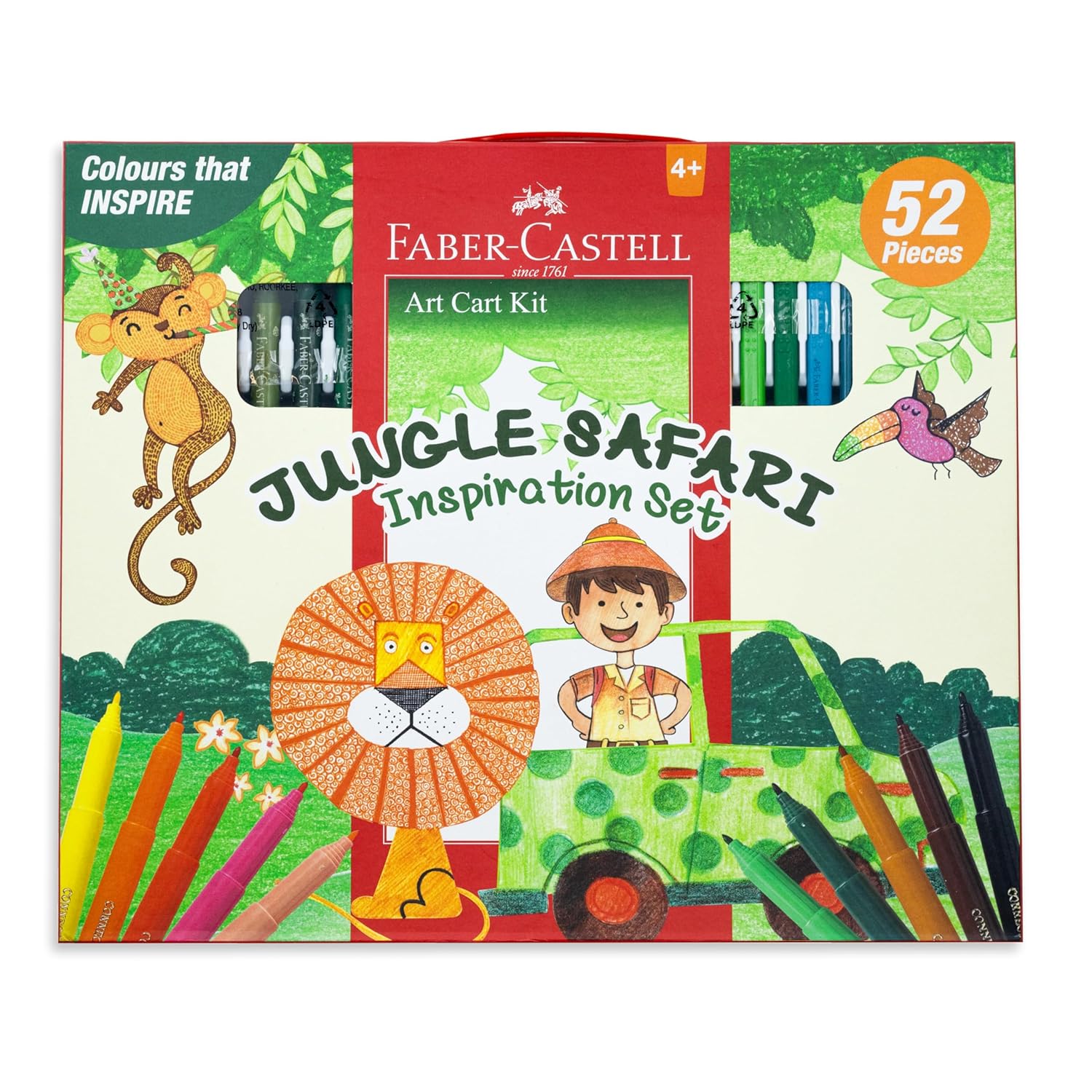 - Complete 52-Piece Art Set for Creative Kids – Jungle Safari includes everything your child needs to explore their creativity. The kit features 10 Connector Pens, 10 Oil Pastels, 10 Grip Erasable Crayons, 6 Tempera Paints, 1 Tri-Grip Paint Brush, 1 Sharpener, 1 Eraser, 4 Colouring Sheets, 6 Connector Pen Caps, and 3 Super Connectors