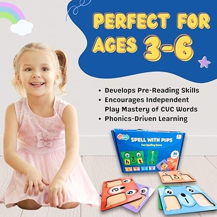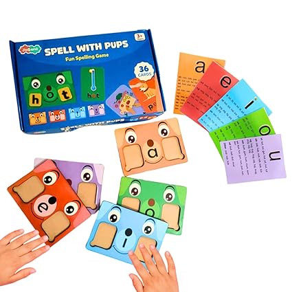 - 🎓 Make Reading Fun – Kids build over 50+ three-letter CVC words (like CAT, DOG, SUN) with cute puppy-themed cards. Perfect way to learn spelling through play.