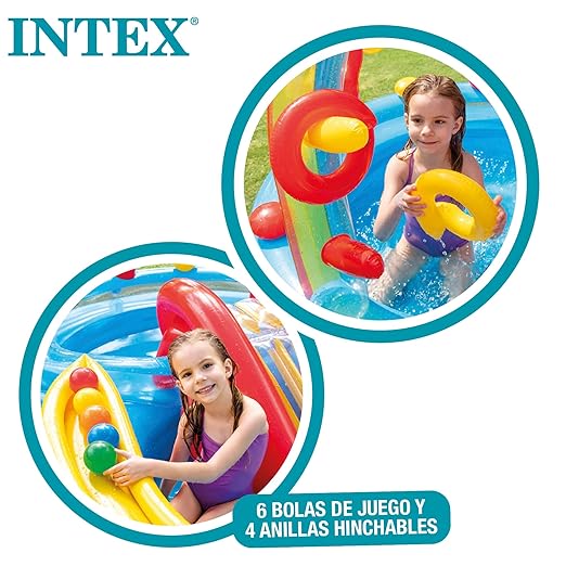 Transform your backyard into the favourite neighborhood hangout this summer with the Intex rainbow ring play centre. You will love the slippery water slide, raging ring toss game, and all the super fun ball games included in this mini water park. Built-in sprayer attaches easily into a standard garden hose; comes ready for fun with 6 play balls and 4 inflatable rings; includes repair patch; warning: choking hazard small parts. Not for children under 3 yrs.; easy to store and transport. Great size for small backyards Intex kid’s inflatable rainbow ring water play centre with quick fill air pump.